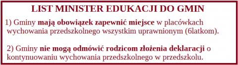 1). Każdy burmistrz w mieście lub wójt na wsi ma obowiązek zapewnić miejsce w placówkach wychowania przedszkolnego wszystkim uprawnionym dzieciom (a więc przede wszystkim 6-latkom, które jako jedyne mają obowiązek przygotowania przedszkolnego). Natomiast wybór miejsca realizacji edukacji pozostaje w kompetencjach rodziców.